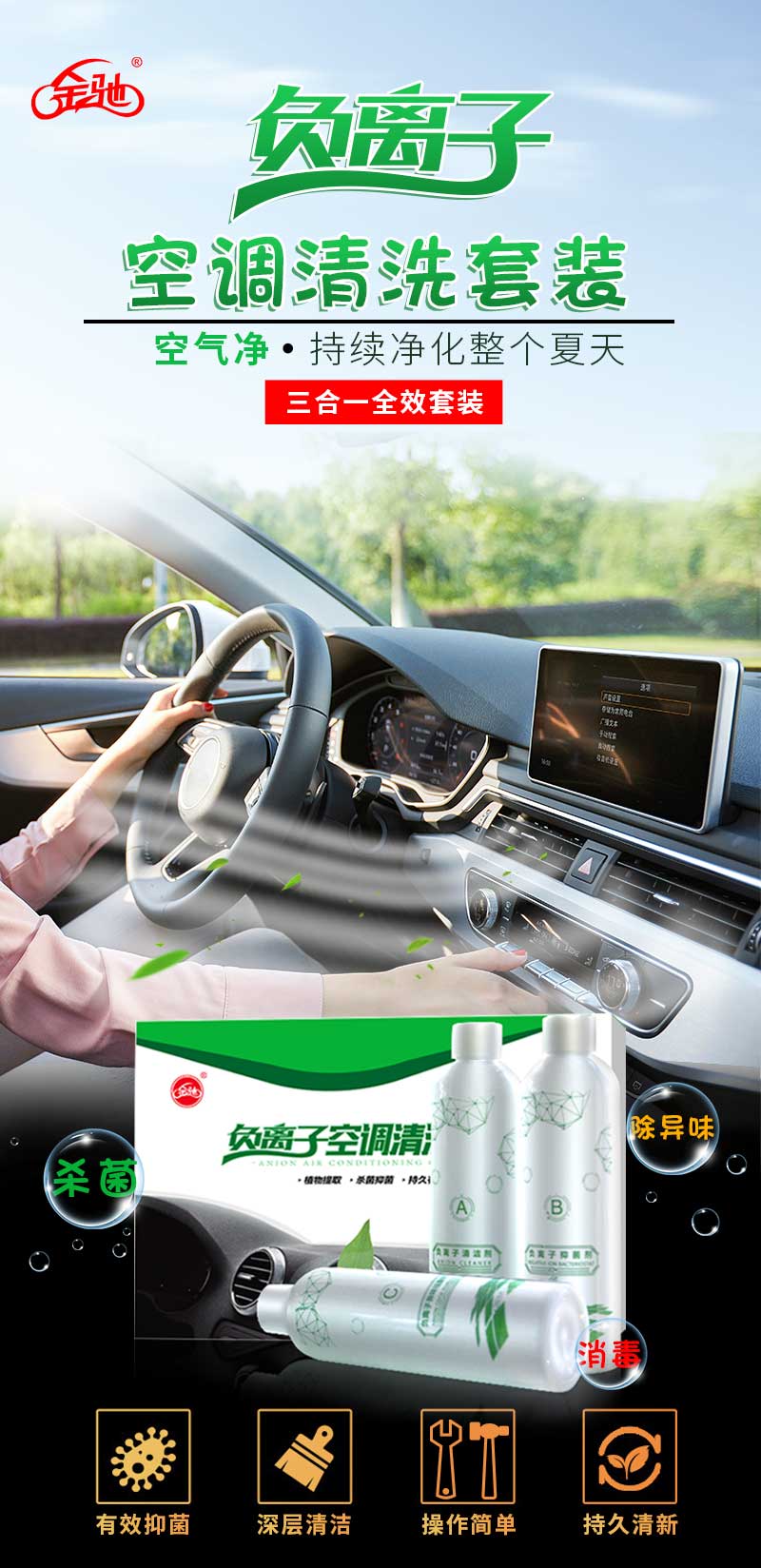 金馳負(fù)離子空調(diào)清洗套裝,三步解決以上問題。為你及你的愛車,提供專業(yè)的健康保障。